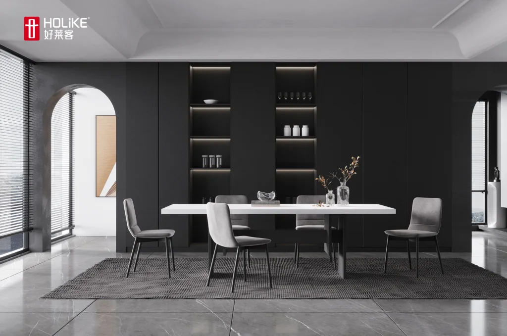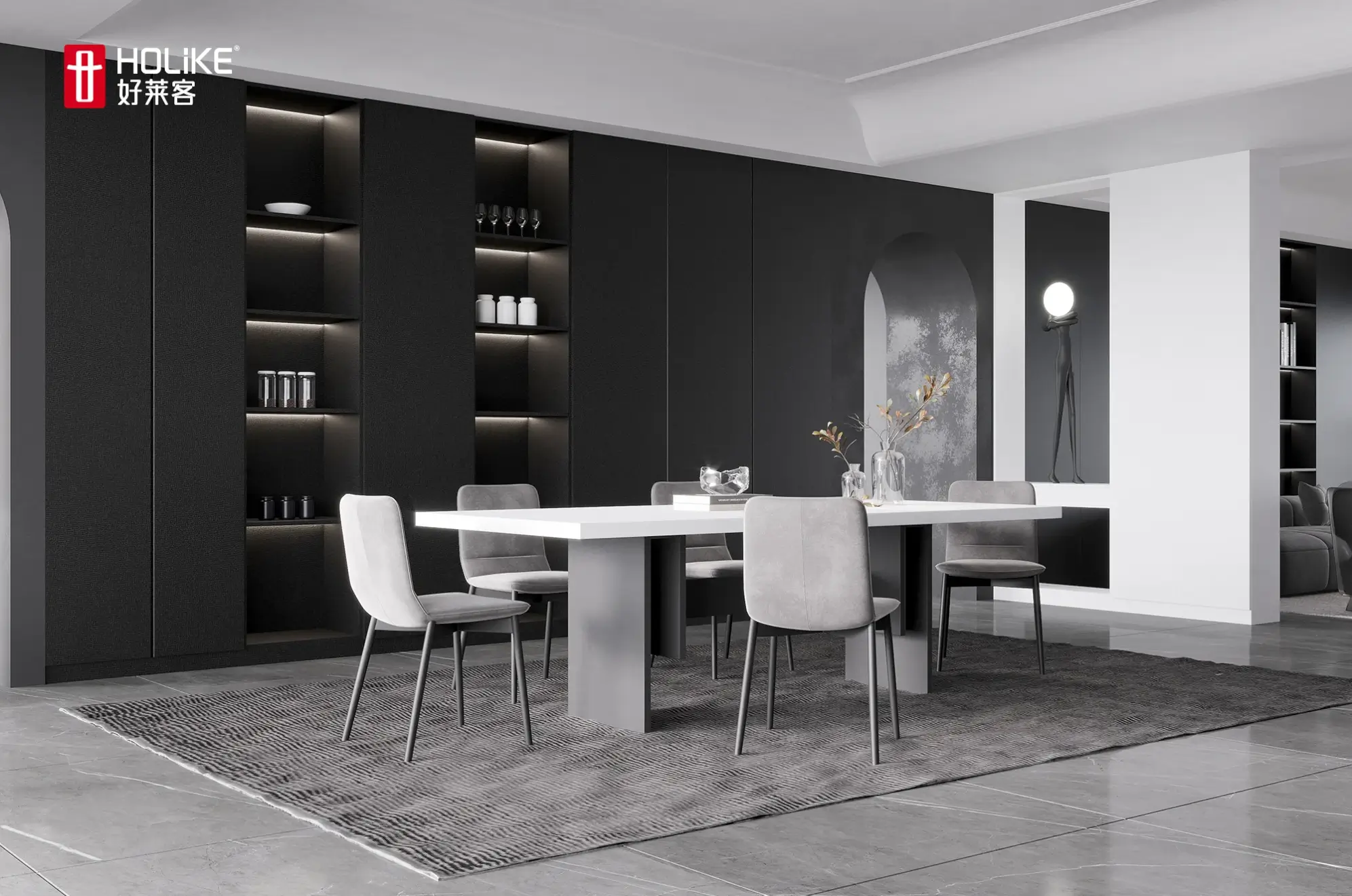 The light strips are paired with convex glass cabinets to create a layered facade effect and a three-dimensional and full spatial shape. The curved and saturated arc wall outlines a comfortable and spacious space, allowing light to flow freely, creating an elegance that touches the heart.