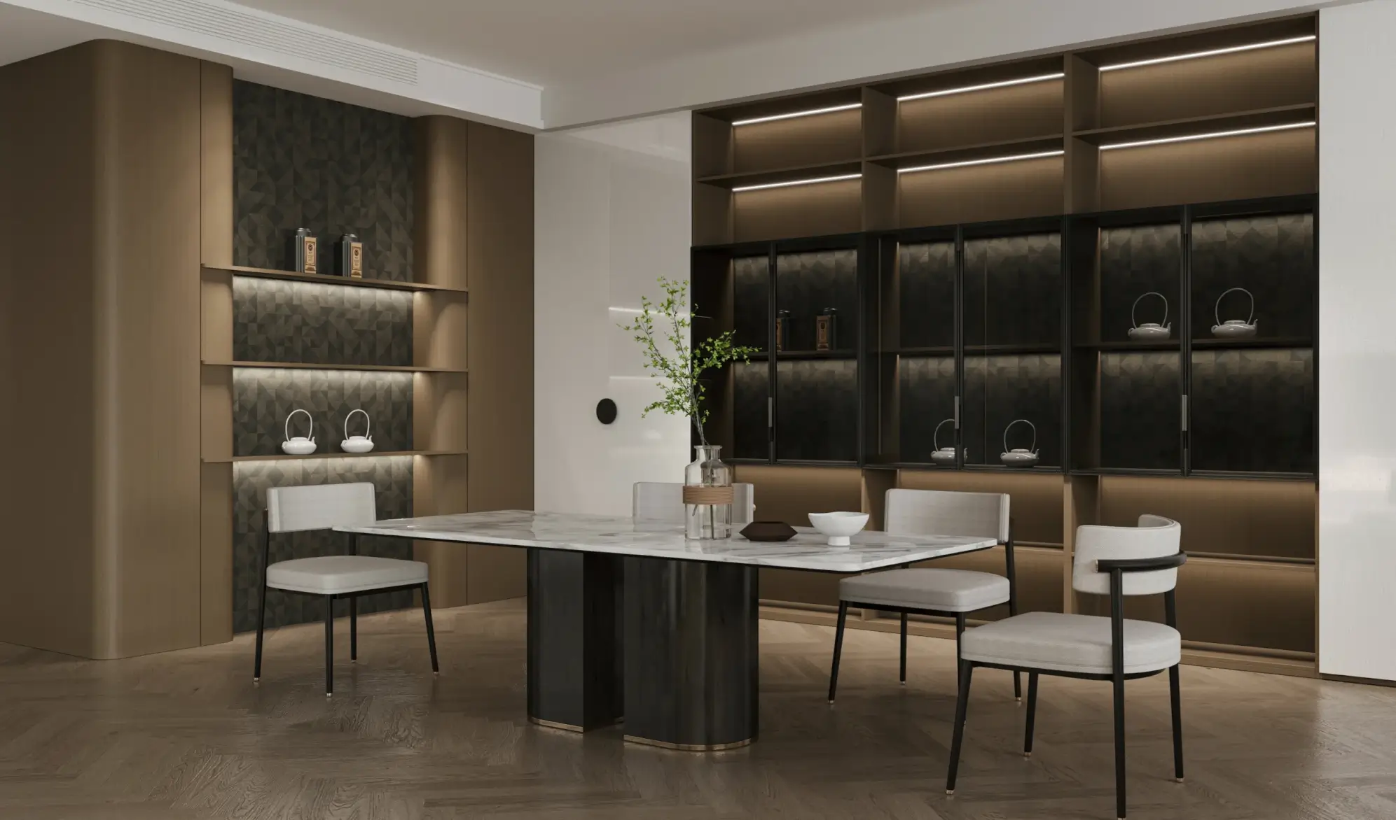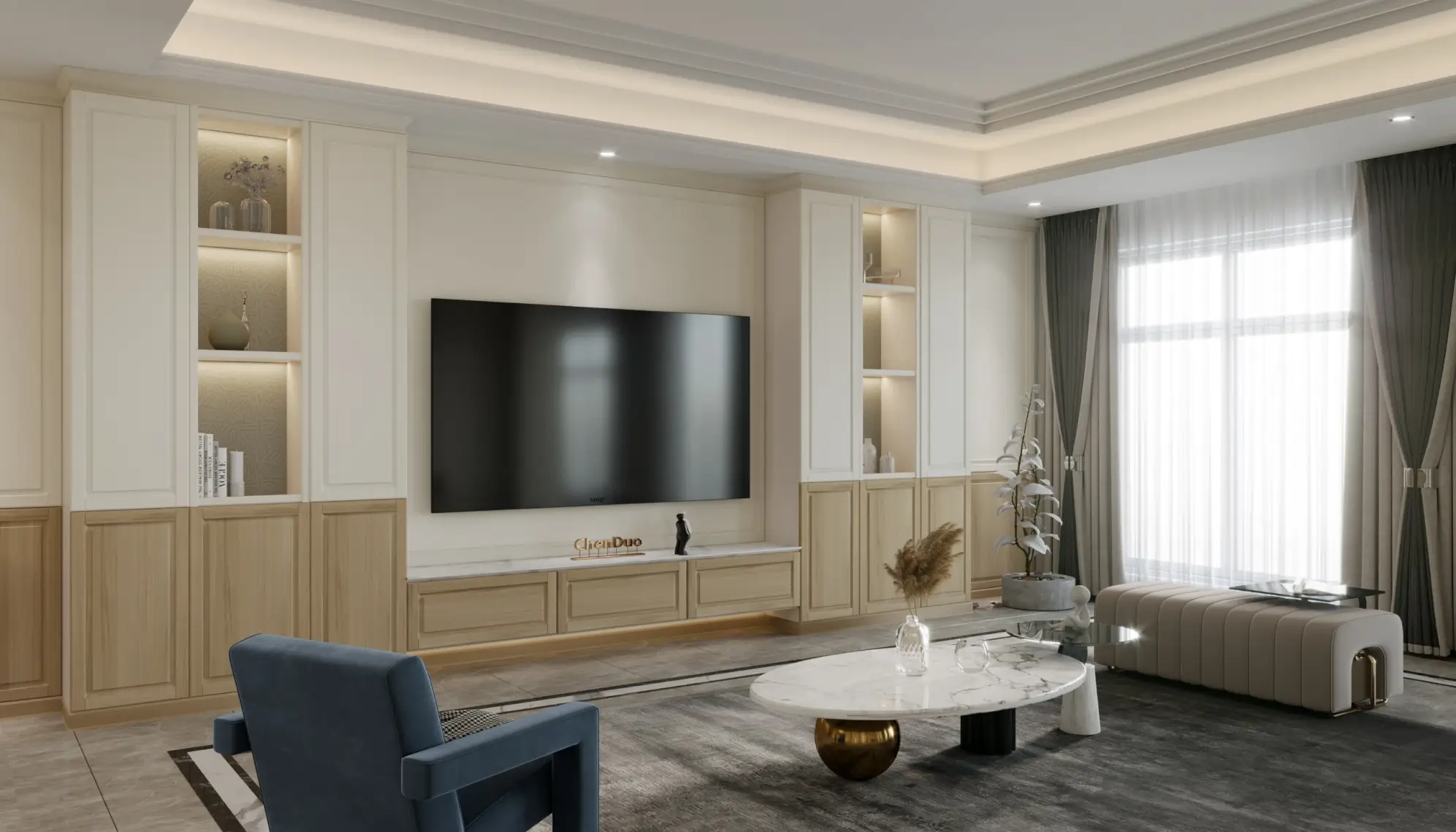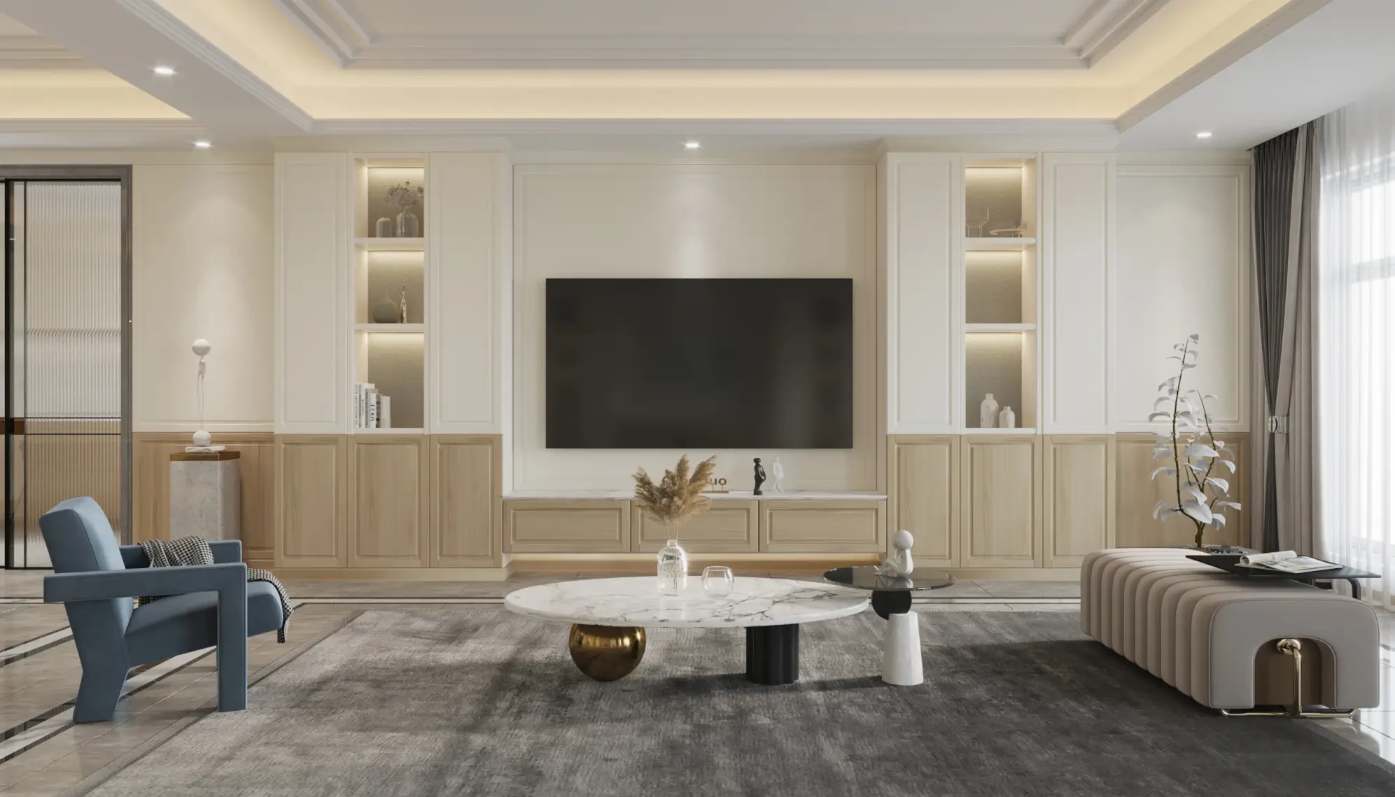 The light strips are paired with convex glass cabinets to create a layered facade effect and a three-dimensional and full spatial shape. The curved and saturated arc wall outlines a comfortable and spacious space, allowing light to flow freely, creating an elegance that touches the heart.