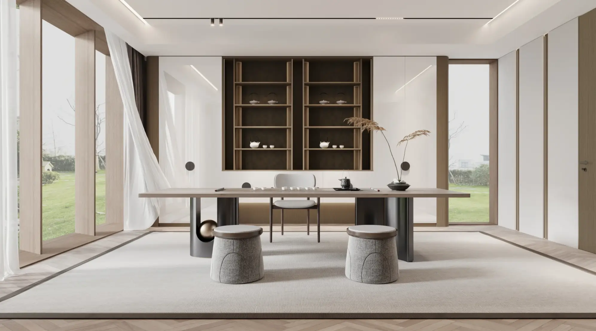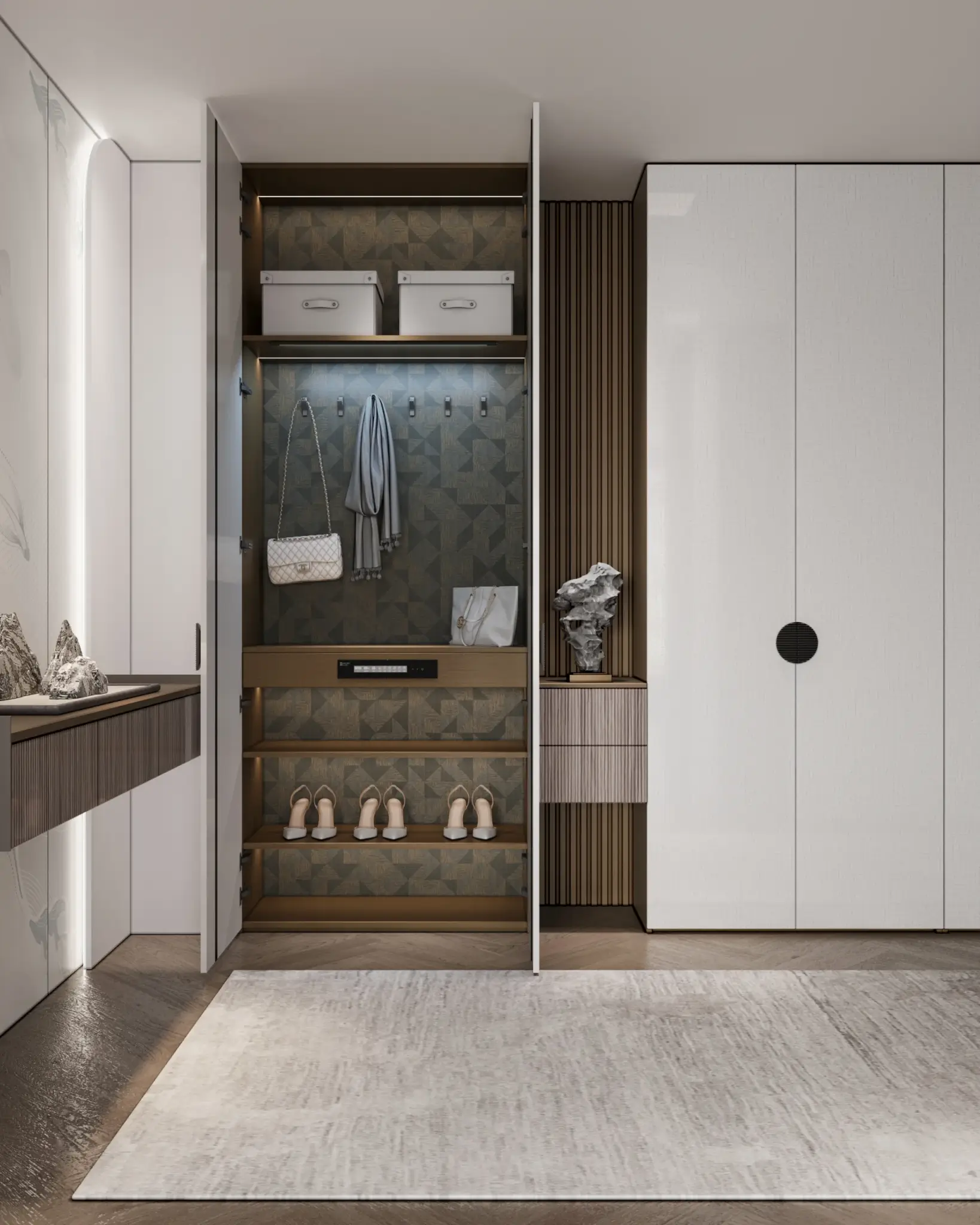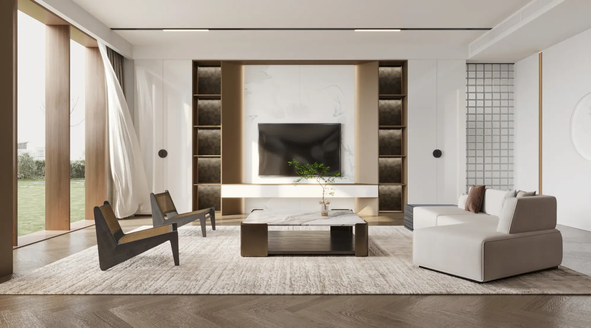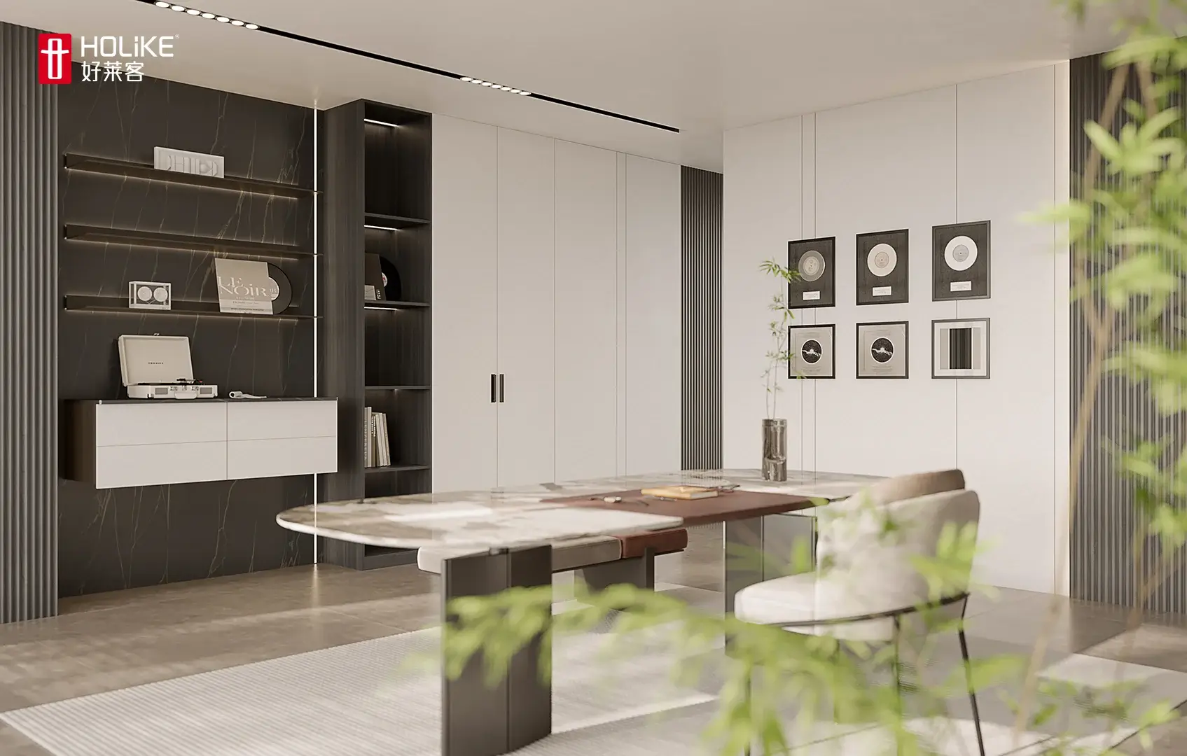 The light strips are paired with convex glass cabinets to create a layered facade effect and a three-dimensional and full spatial shape. The curved and saturated arc wall outlines a comfortable and spacious space, allowing light to flow freely, creating an elegance that touches the heart.
