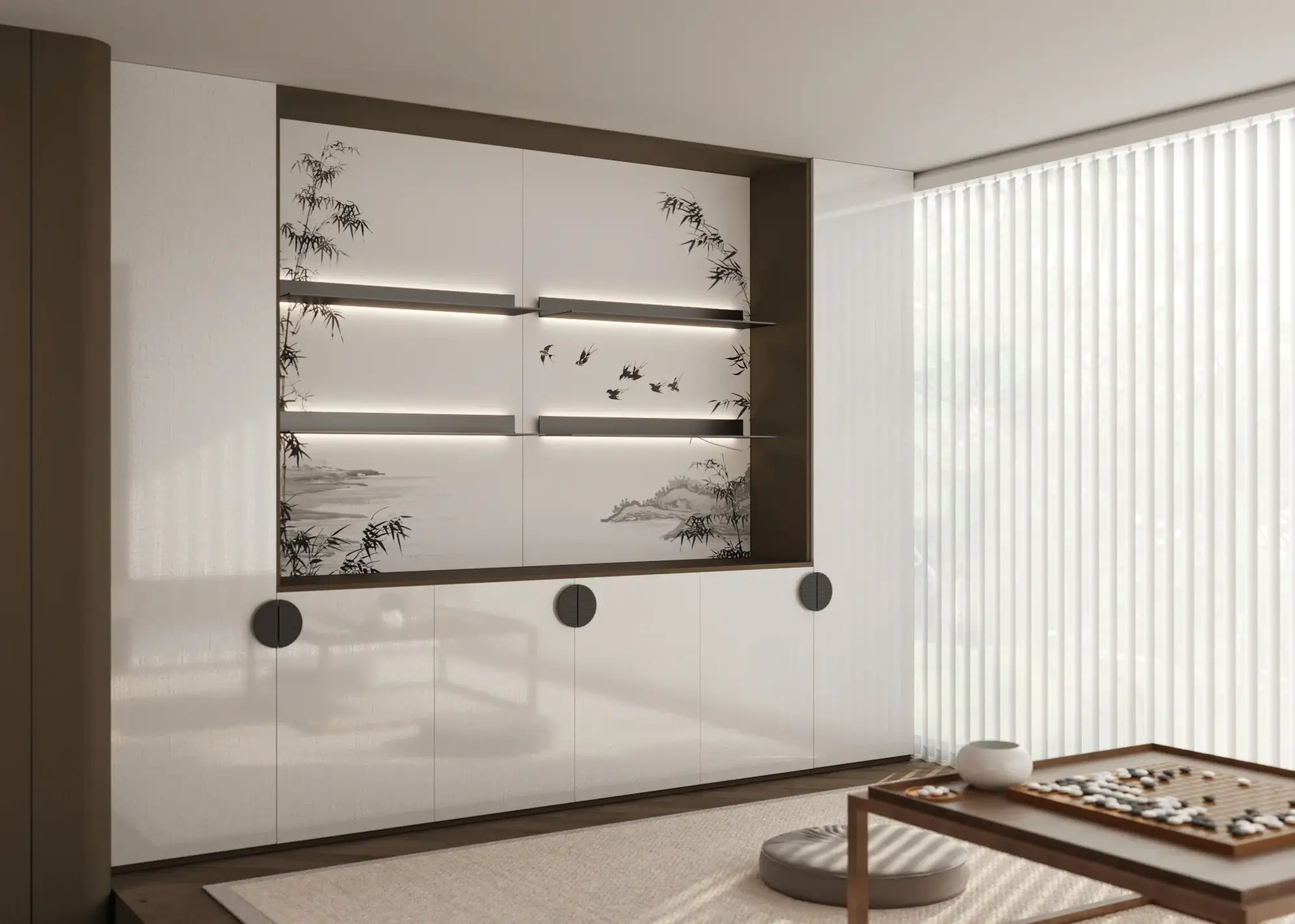 One cabinet to the top design, bid farewell to the stacking of cabinets, creating a clever and light space The arc parapet naturally connects the living room space, weakening the visual abruptness and improving the openness and transparency of the space.