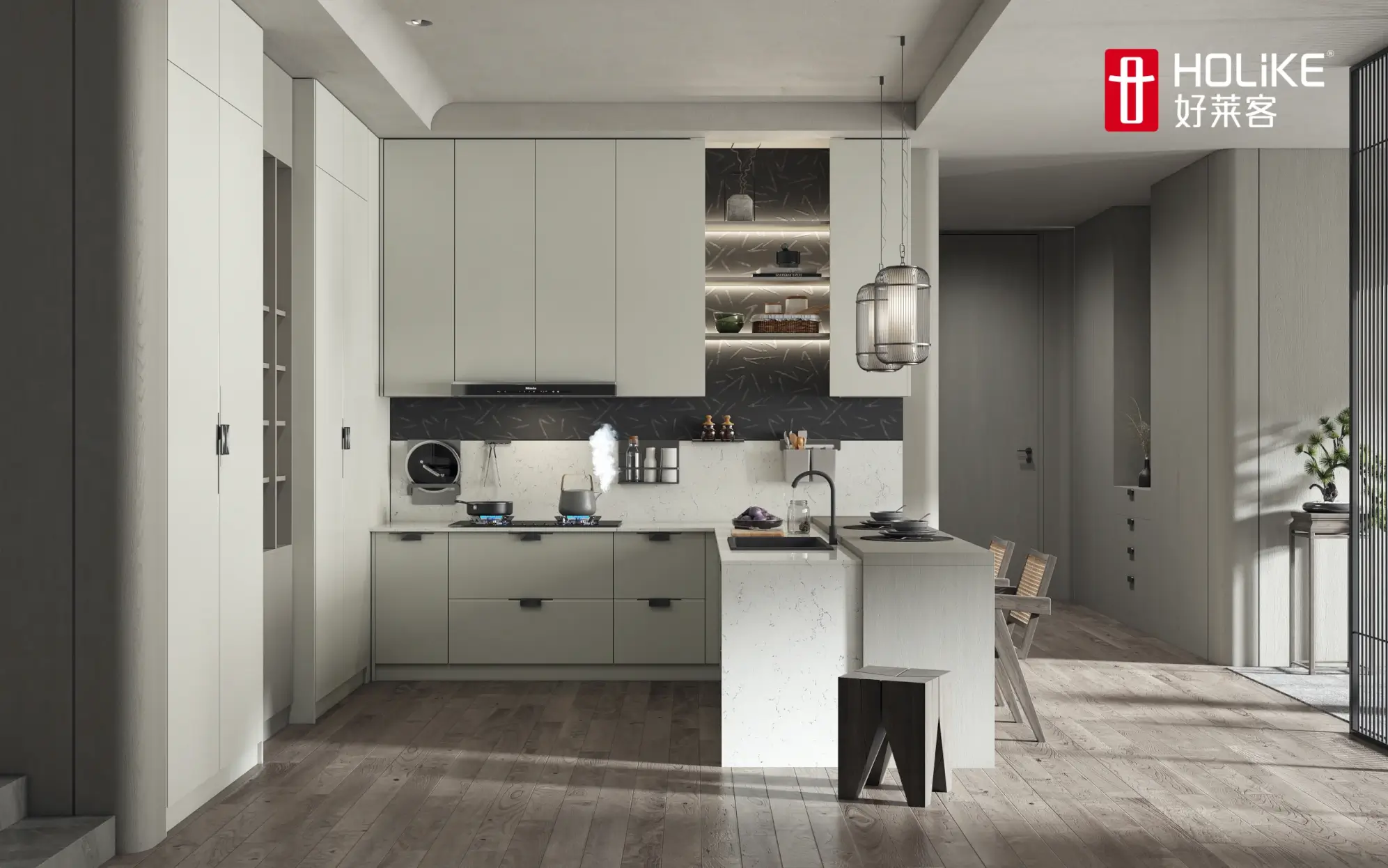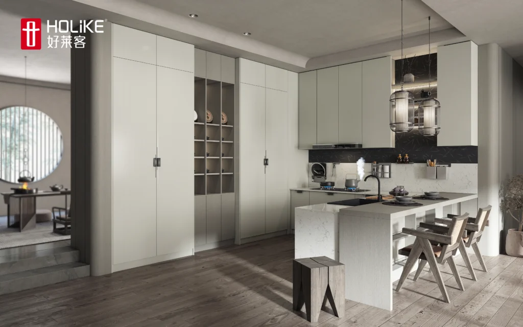 One cabinet to the top design, bid farewell to the stacking of cabinets, creating a clever and light space The arc parapet naturally connects the living room space, weakening the visual abruptness and improving the openness and transparency of the space.