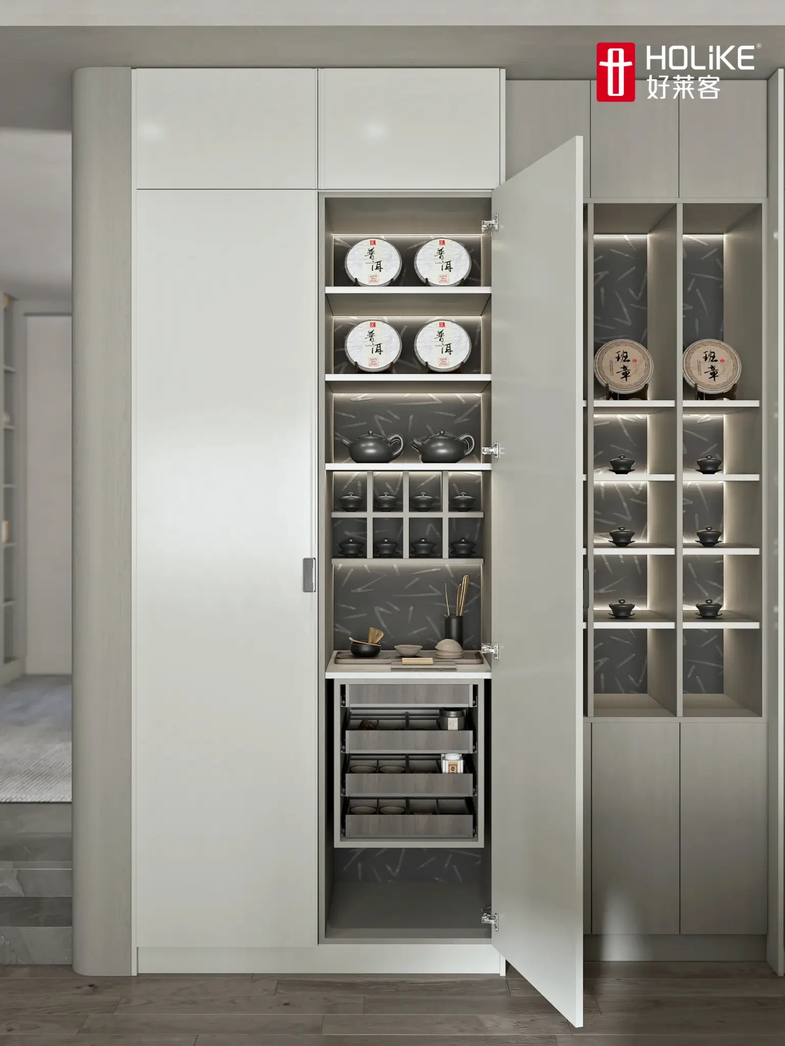 The light strips are paired with convex glass cabinets to create a layered facade effect and a three-dimensional and full spatial shape. The curved and saturated arc wall outlines a comfortable and spacious space, allowing light to flow freely, creating an elegance that touches the heart.