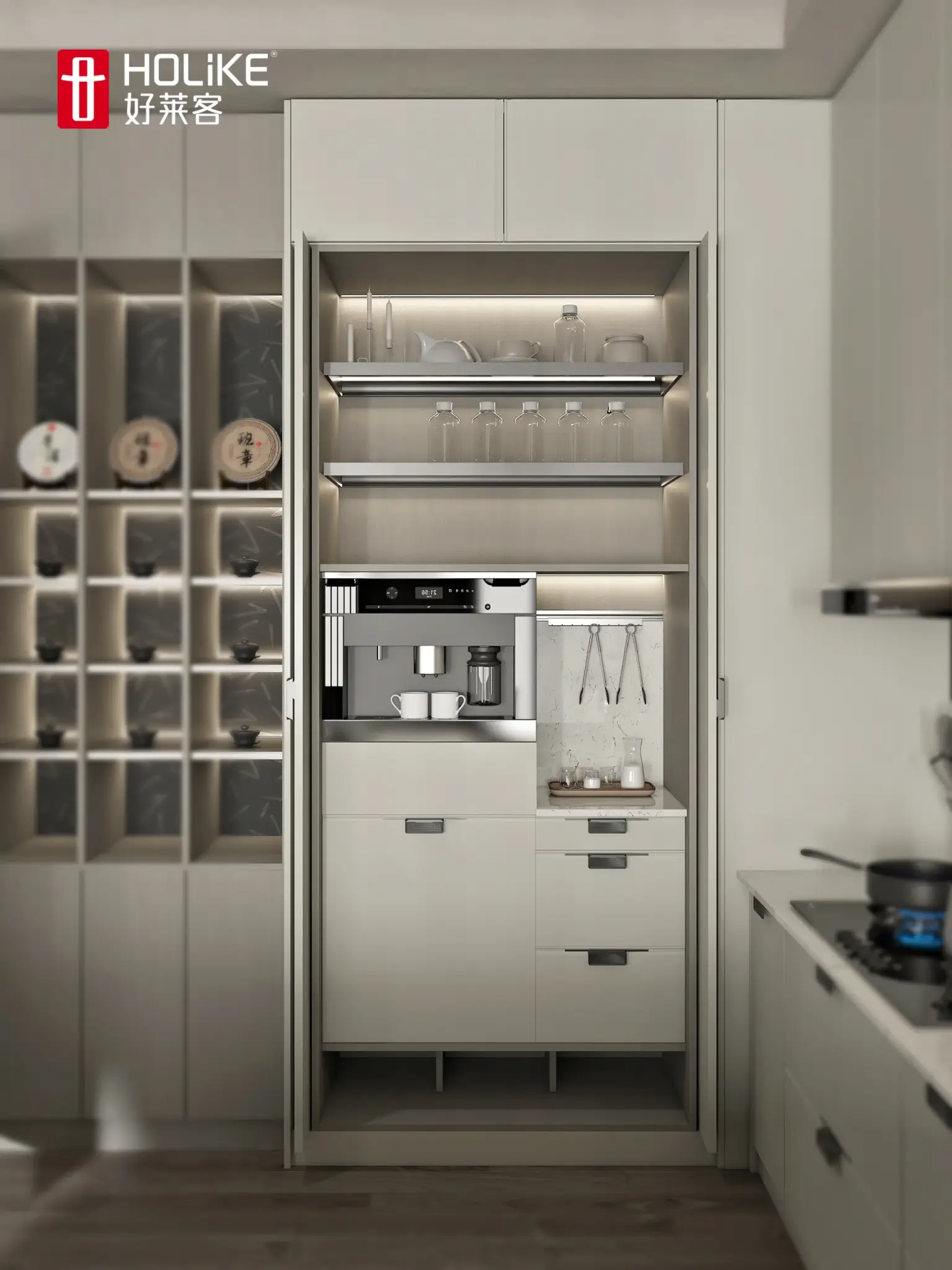 Breaking away from the traditional wine cellar space context, introducing natural light to depict the rich cabinet structure The cabinets are divided into blocks to divide the space in a simple way, allowing you to enjoy the romance of the cellar privately.